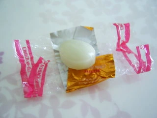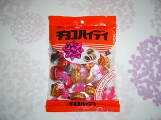 半透明の砂糖の塊みたいな飴の中にチョコクリームみたいのが入ってるやつ。…たいして美味しくない(← ;;)けど懐かしい味がしました。