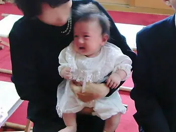 祈祷の間も泣いていたノスケくんですが、終わる頃にはケロッとして、しきりに天井を見上げていました。薄暗い雰囲気が不思議だったのかもしれませんねぇ。