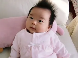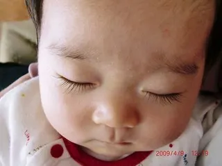 モモちゃんは、髪の毛もフサフサですが、まつげもフサフサです。 これは私似ですね~。 私は時々、セサミストリートのゾウさんみたいな目だねと言われます。長くて、密集して生えているんです。宝塚みたいになって…