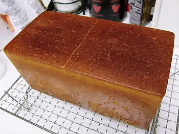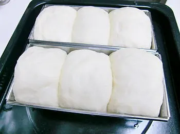 100均の型で食パン。とりあえず、特別なレシピではなく、いつものパン生地で。今回は、コネをホームベーカリーでやりました。 ↓ 二次発酵後 ↓ 焼きあがり 予想以上に生地が膨らんで、上がちょい焦げました…