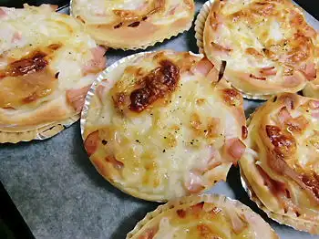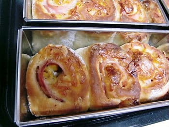 レンジを新しくしてから作った惣菜パンの中で、私が一番美味いと思ったのが 「ハムたまチーズパン」です。(↑ この「たま」は、たまねぎのたまです;) ↓ 一次発酵後の生地にいろいろのっけて巻いて ↓ 8つ…